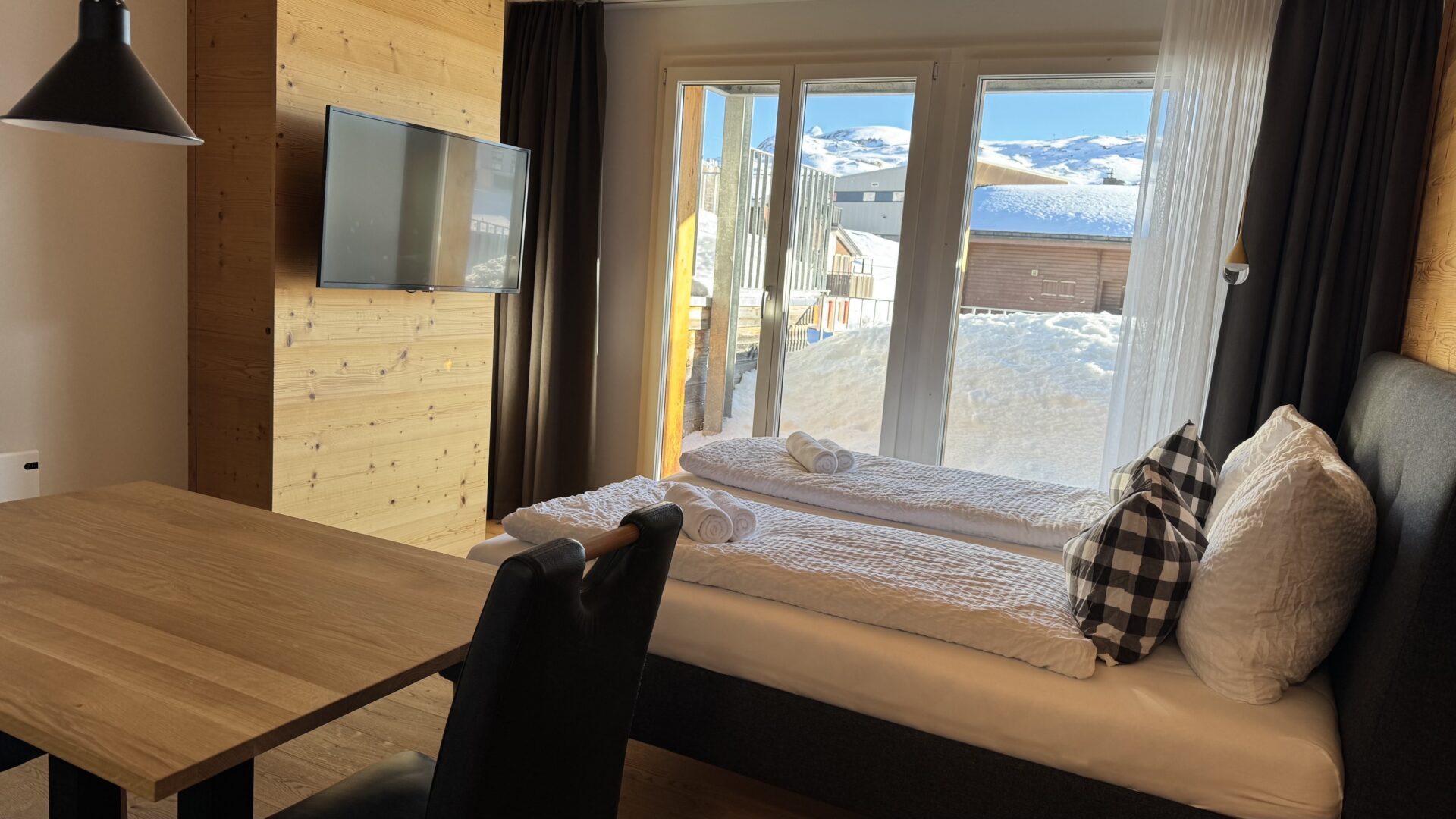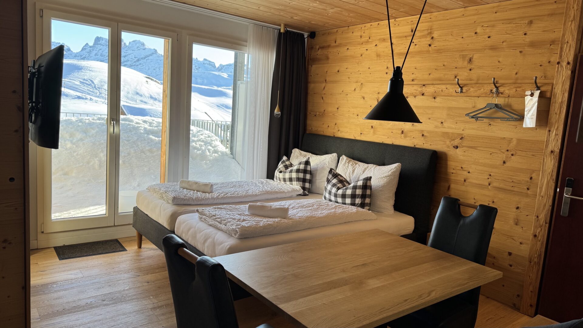 Doppelbett unterhalb Fensterfront mit Panoramaaussicht. Zustellbett für Kind und Babybett möglich.